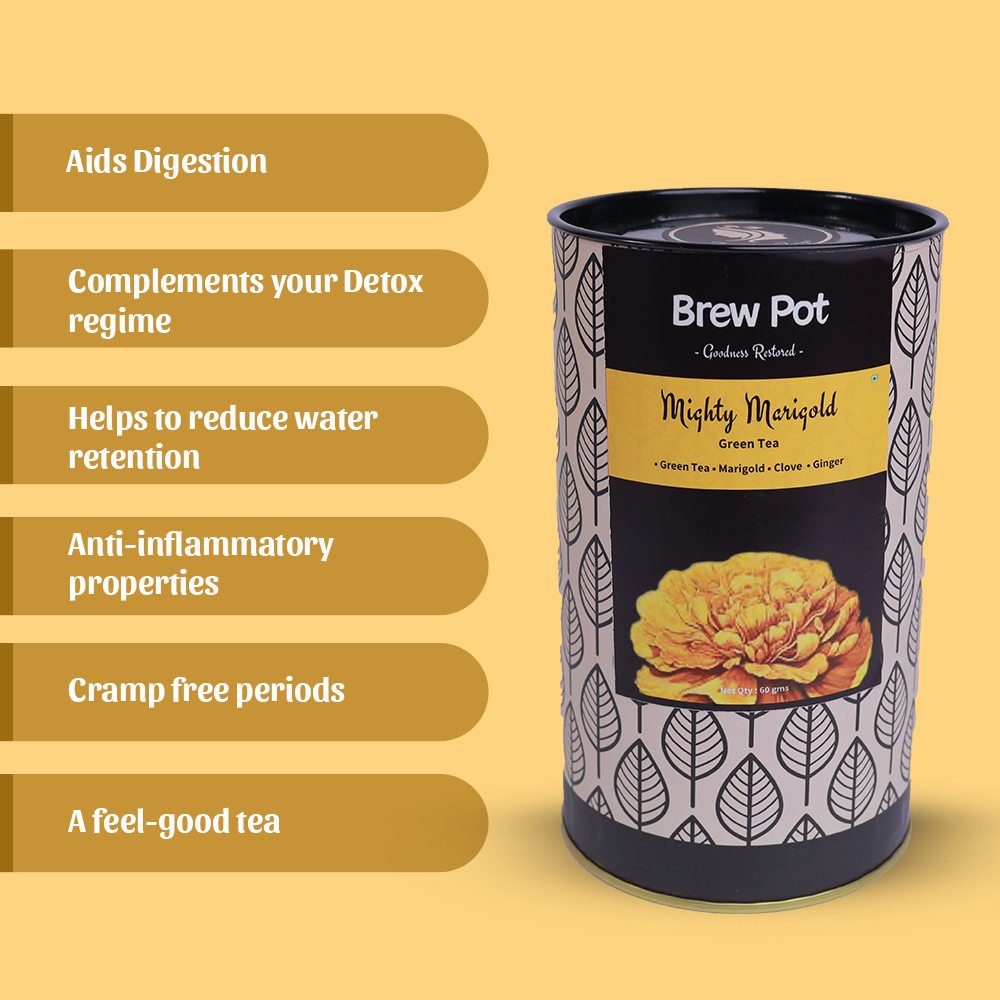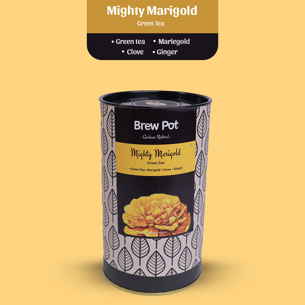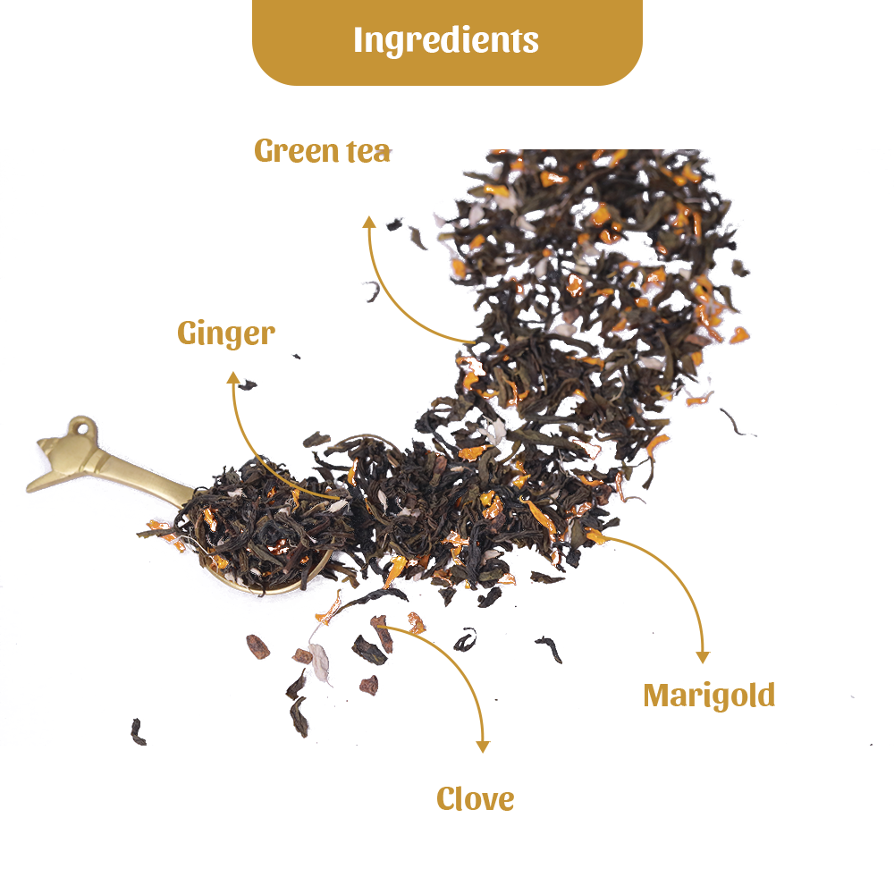 The blend of green tea with the flower of youth- Marigold and enhanced by hints of clove and ginger is a perfect treat to your tongue and skin. With Pot Marigold ,the hero of many skincare products, reminisce about the summer sunshine with this tea.