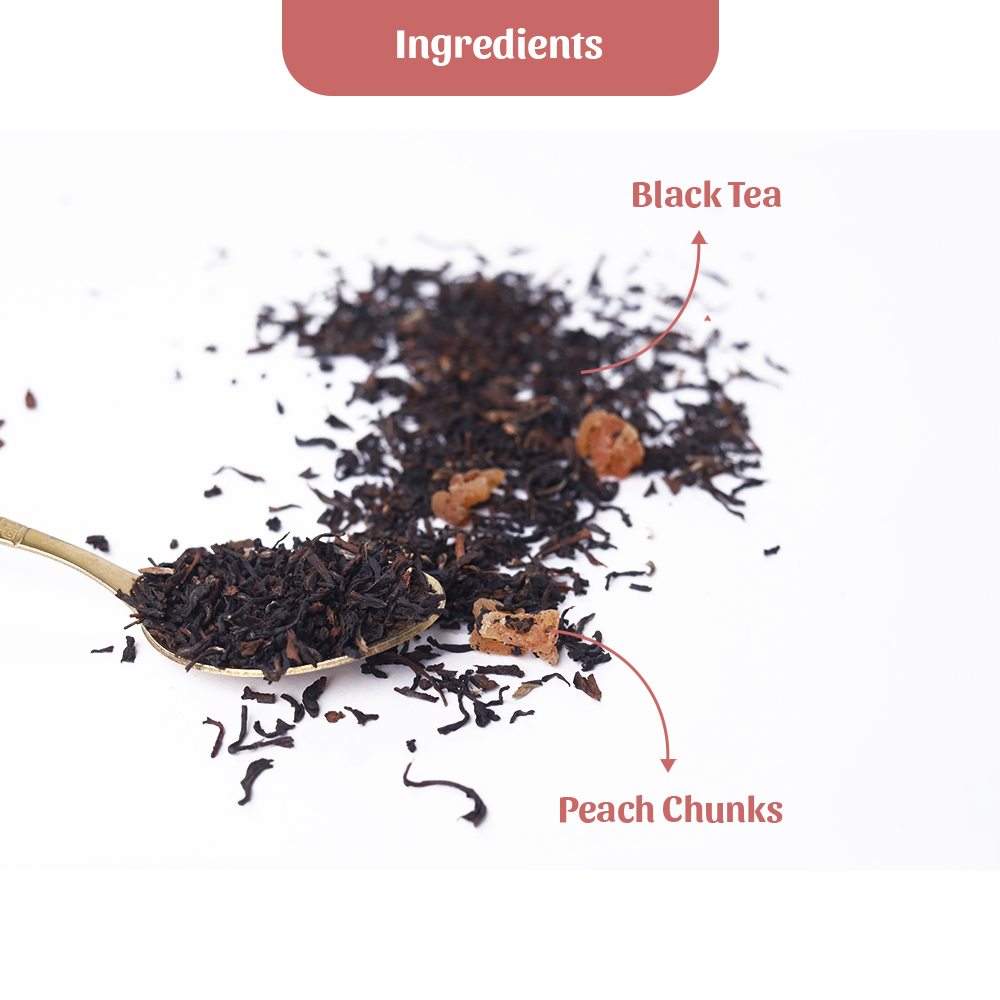 Our curated blend of black tea and sun ripped peaches will have you dreaming of a relaxing stroll through lush fruit orchards. This tea will bring you the delight of summer all year round.